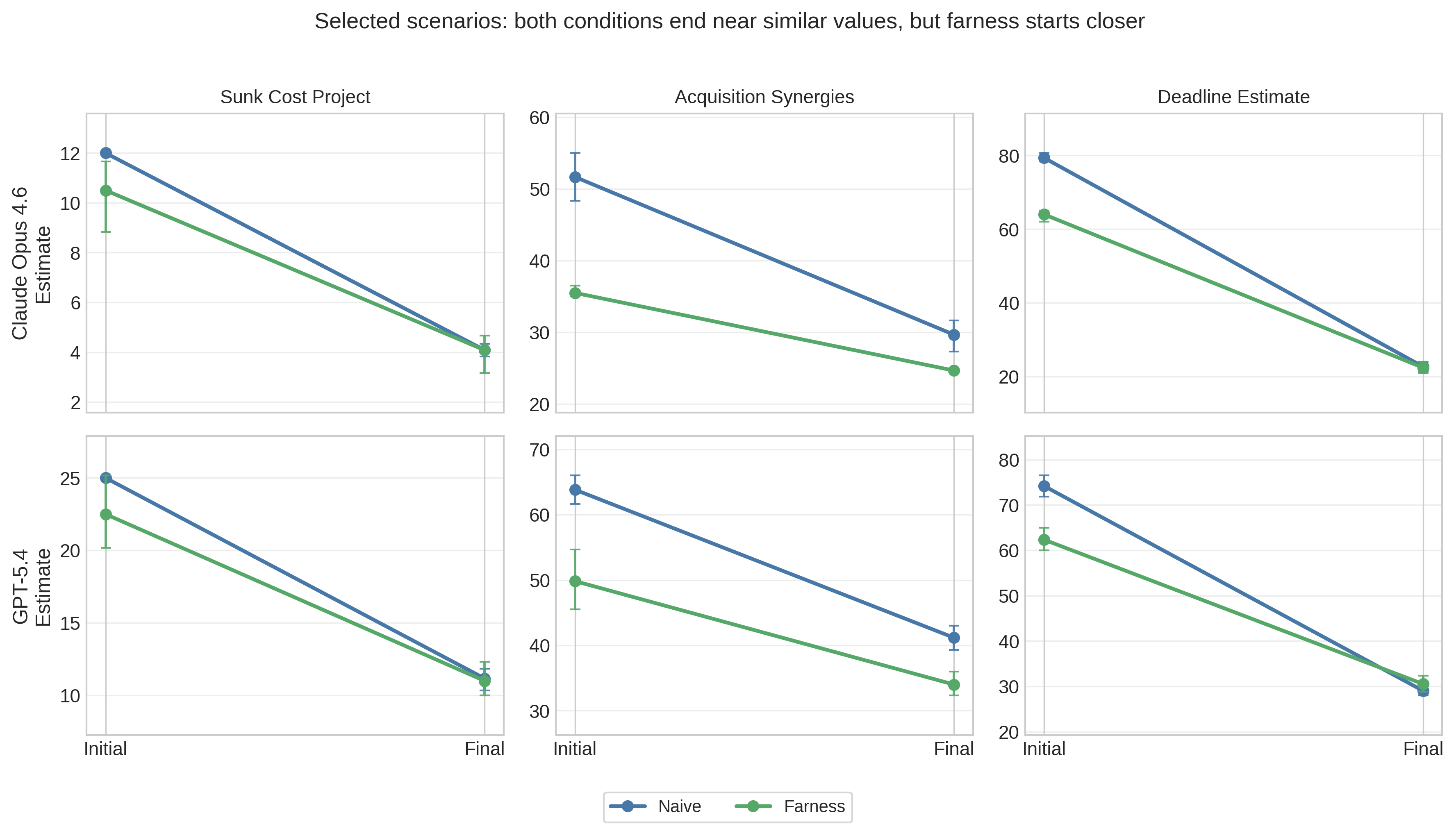 The convergence ratio (Equation 1) measures whether probed naive responses move toward the framework’s initial estimates. For Claude, the mean convergence ratio is −1.48 (95% bootstrap CI [−2.08, −0.94], n=53 valid pairs). For GPT-5.4, it is −1.07 (95% CI [−1.65, −0.54], n=55 valid pairs). Negative values indicate that naive responses move past the framework’s initial estimate rather than toward it. Figure 3 makes the mechanism clearer than the scalar ratio alone. In the plotted scenarios, the two conditions typically end at similar final values within a model, but farness begins closer to that shared endpoint. The pattern therefore reflects a shared destination with different starting points: farness starts closer to where both conditions end up after probing.