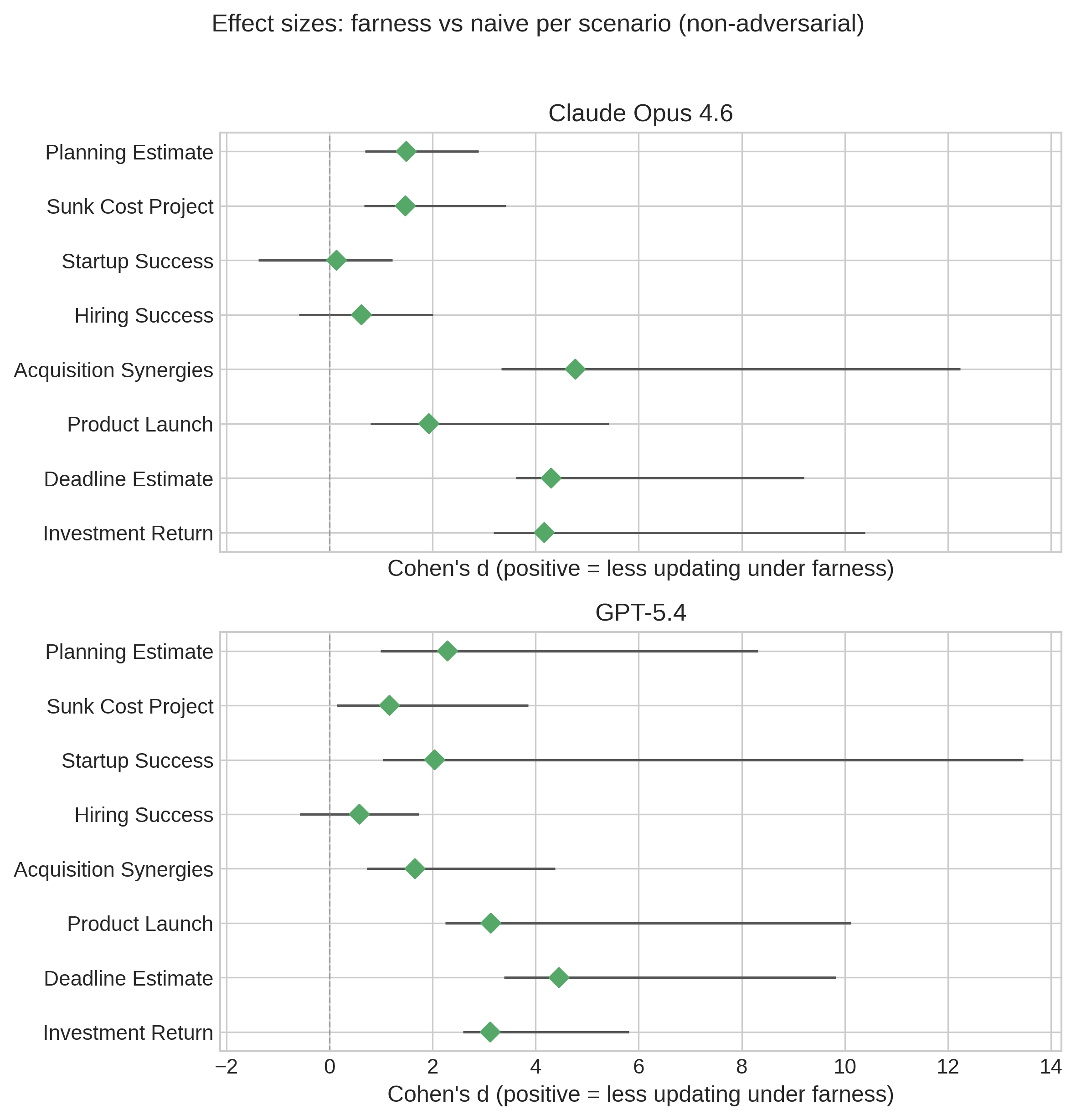 After Holm-Bonferroni correction, no comparison reaches conventional significance at alpha=0.05. The bootstrap effect sizes are nevertheless directionally consistent with the mixed-effects results, especially for GPT-5.4 naive versus farness. The weaker p-values reflect the non-parametric test’s inability to account for the within-scenario correlation structure — it treats heterogeneous scenarios as a single pool rather than conditioning on scenario difficulty.