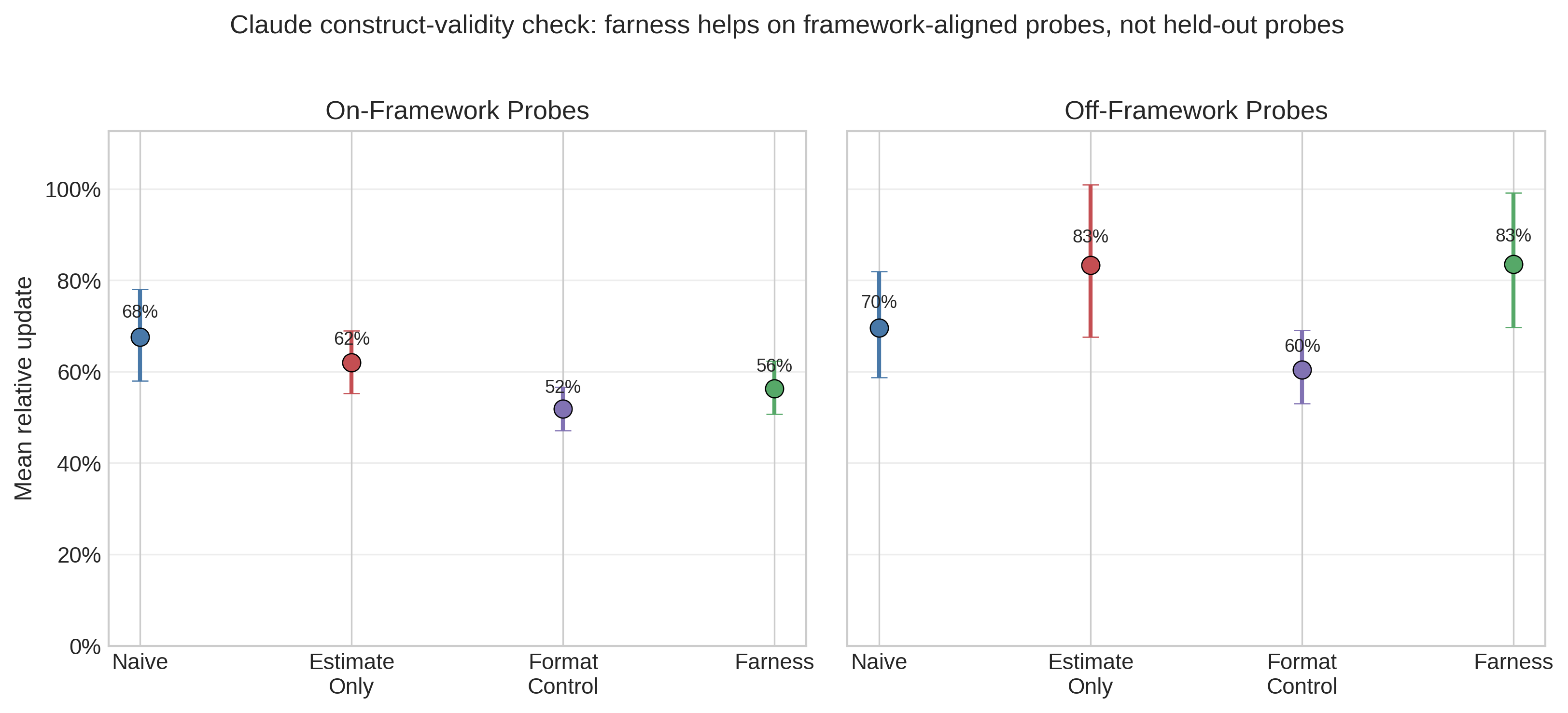 Study 2 then tests construct validity on Claude only across the 8 primary scenarios, adding two control conditions and splitting probes into on-framework and off-framework batteries (n=384). On framework-aligned probes, farness remains more stable than naive (56% vs 68%, coefficient = −0.112, p<0.001). On held-out probes, that advantage disappears and reverses (83% vs 70%, coefficient = +0.139, p=0.01), while a format-only control is descriptively the most stable off-framework condition. The main contribution is therefore methodological. Stability-under-probing can distinguish prompt structures and, crucially, reveal when an apparent framework benefit is mostly prompt-probe alignment rather than broader held-out robustness.