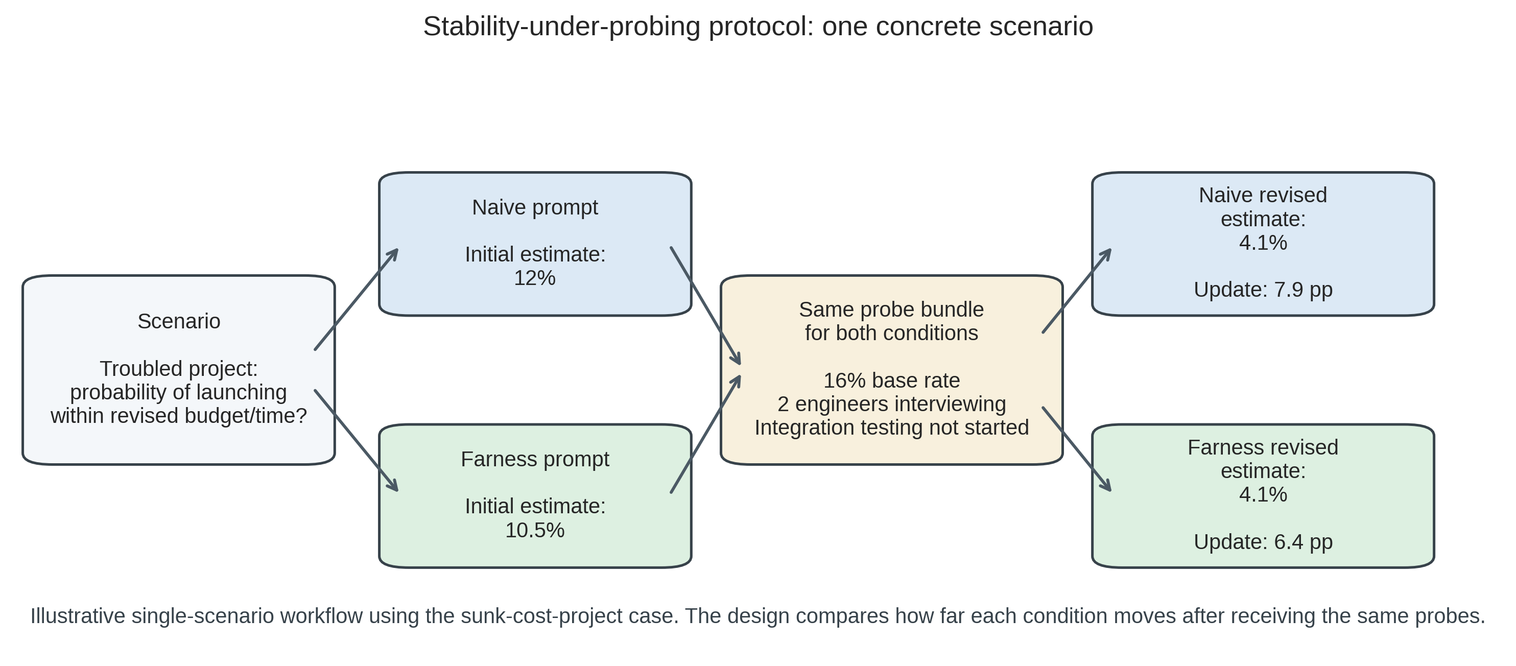 Figure 1 provides the clearest single-example view of the design. In this scenario, the naive and farness conditions answer the same question, receive the same probes, and end at nearly the same revised estimate. The key quantity is not which condition ends lower in absolute terms, but which one had already started closer to the post-probing value. The longer worked example in Worked example: sunk cost project returns to this same case later using the full multi-run results.