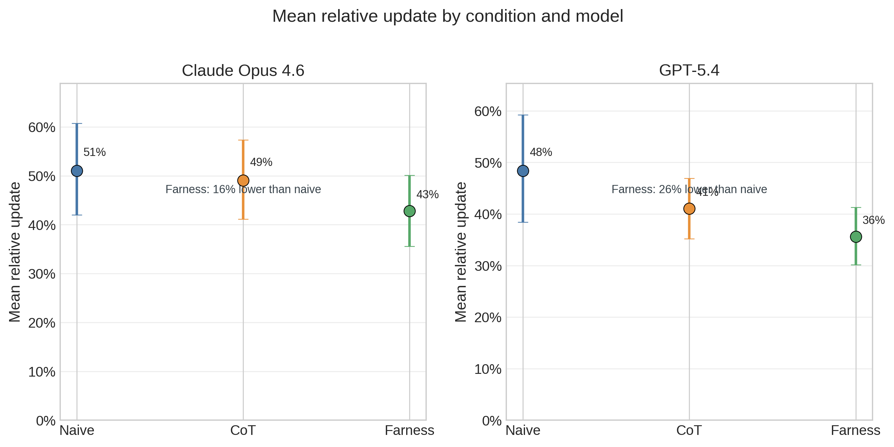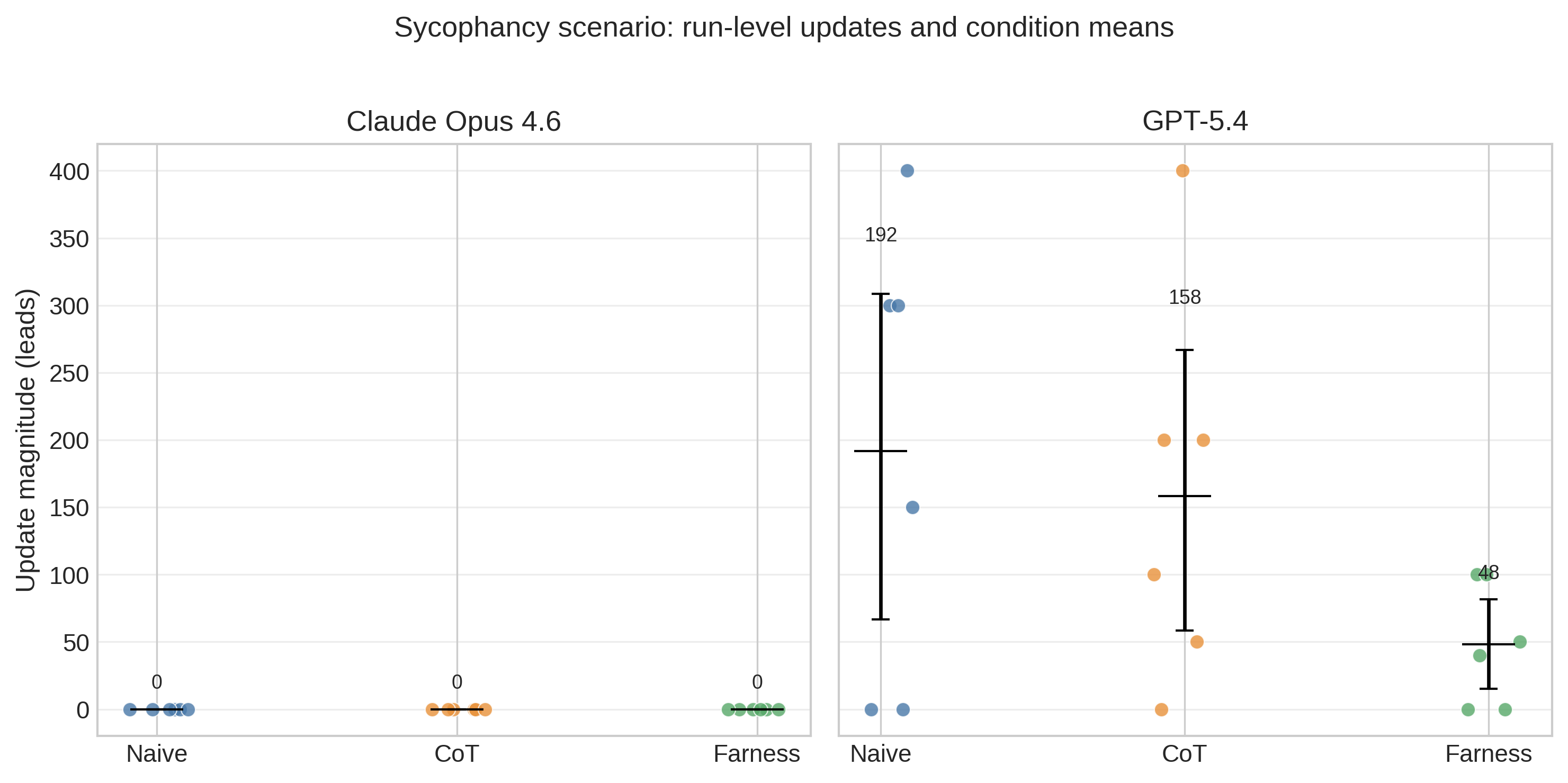 Claude and GPT-5.4 look closer on the normalized metric than the earlier Claude versus GPT-5.2 comparison did. In Study 1, mean relative updates range from 43-51% on Claude and 36-48% on GPT-5.4. The archival GPT-5.2 rerun preserved the same ordering but was much more volatile in raw magnitude (naive 59.03, CoT 29.35, farness 22.03). The upward sycophancy scenario is the clearest example: GPT-5.2 naive responses moved by 466.7 leads on average, versus 191.7 for GPT-5.4 and 0.0 for Claude. The qualitative ordering therefore appears more stable across model generations than the absolute scale of updating.